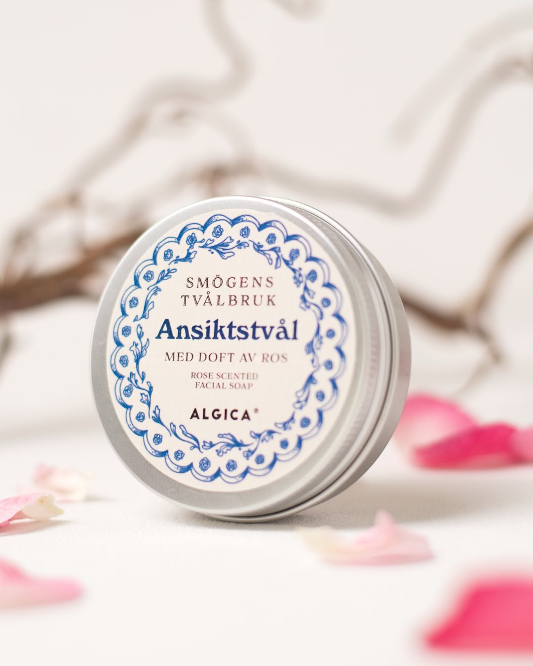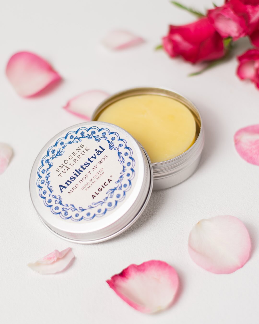 Vi är så glada att få sälja denna underbara ansiktstvål från Smögens tvålbruk. Tvålen doftar ljuvligt av ros och innehåller Algica, ett ämne framställt ur kiselalger som både rengör och återfuktar huden.